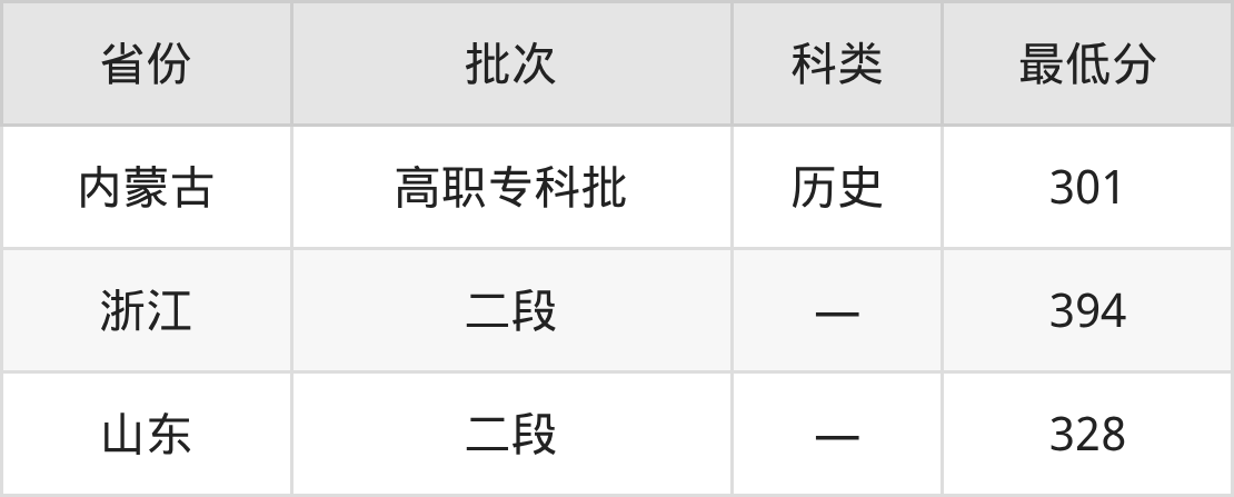 西安交通工程学院现代物流管理专业在全国各省最低录取分数线为301分(内蒙古历史类),除此之外,在其余地区的最低分为浙江394分、山东328分,以上数据均为2025年数据,供2026年高考生参考。