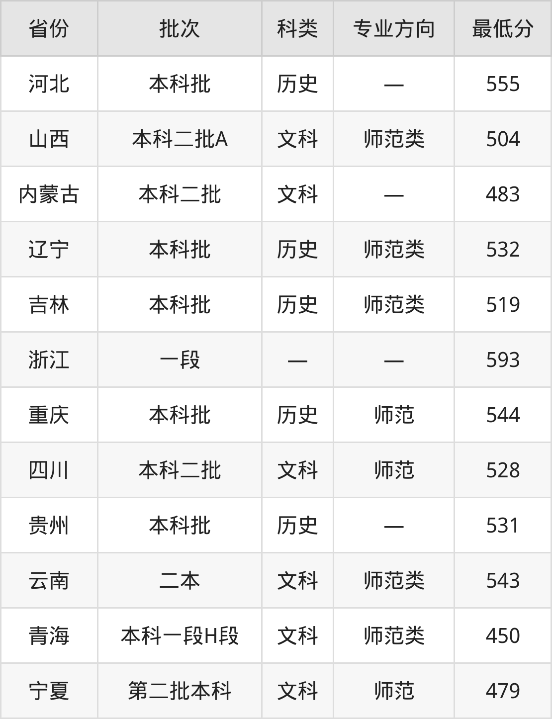 绵阳师范学院汉语言文学专业录取分数线从450分到593分不等,在部分地区的最低分数线如下: