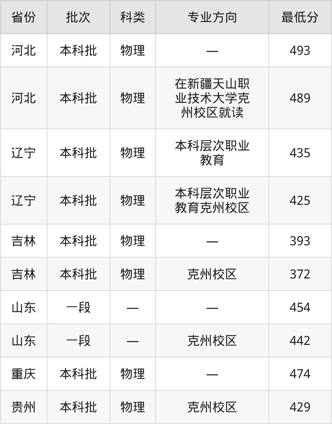 新疆天山职业技术大学新能源汽车工程技术专业在全国各省录取分数线: