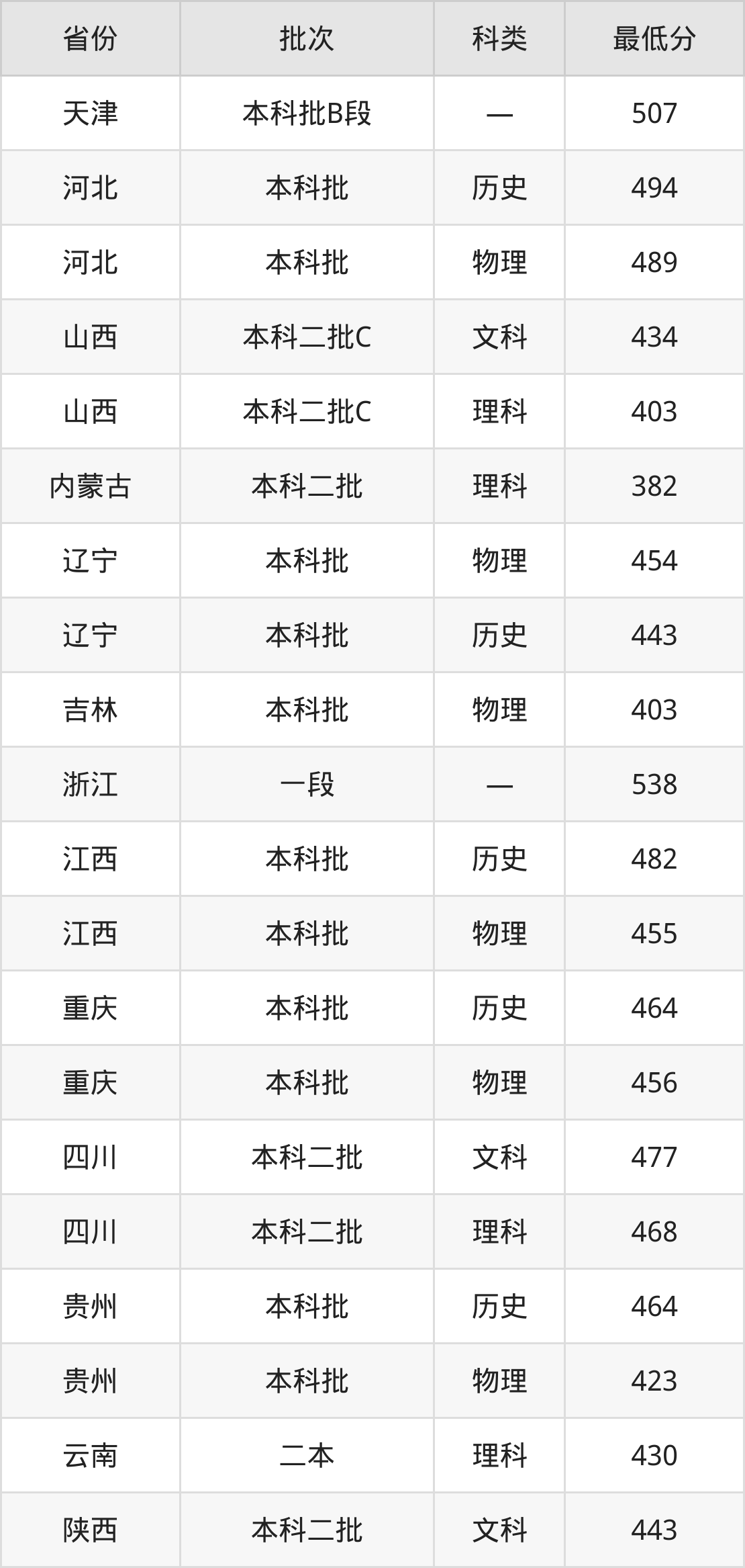 大连财经学院审计学专业录取分数线从382分到538分不等,在部分地区的最低分数线如下: