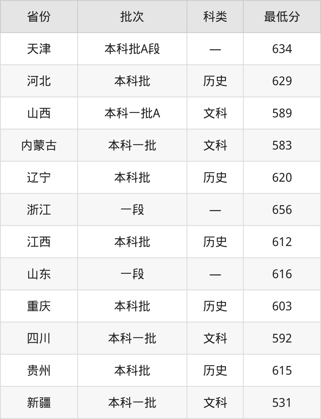 兰州大学法学专业录取分数线从531分到656分不等,在部分地区的最低分数线如下: