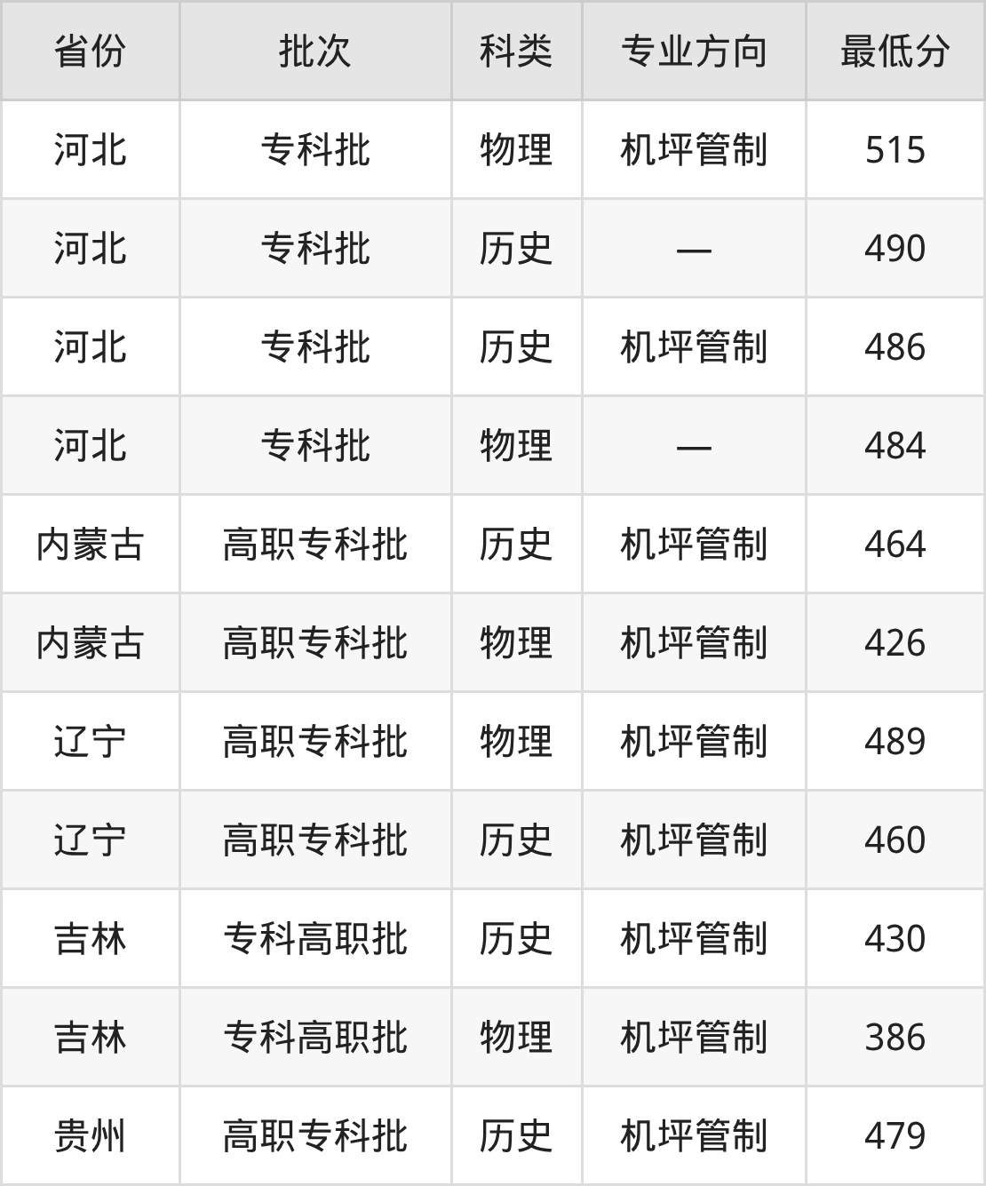 广州民航职业技术学院机场运行服务与管理专业录取分数线从386分到515分不等,最低分数线如下:
