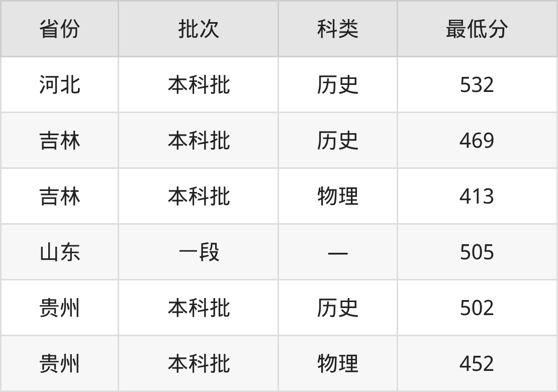 白城师范学院网络与新媒体专业在全国各省最低录取分数线为413分(吉林物理类),除此之外,在其余地区的最低分为河北历史类532分、山东505分、贵州物理类452分,以上数据均为2025年数据,供2026年高考生参考。