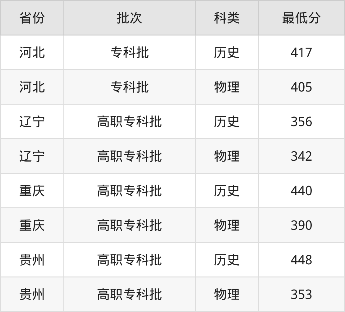 昭通卫生职业学院康复治疗技术专业在全国各省最低录取分数线为342分(辽宁物理类),除此之外,在其余地区的最低分为河北物理类405分、重庆物理类390分、贵州物理类353分,以上数据均为2025年数据,供2026年高考生参考。