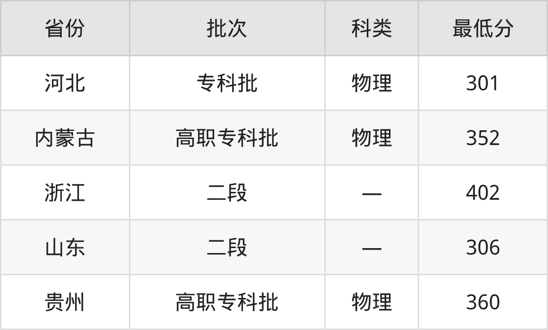 西安汽车职业大学智能网联汽车技术专业在全国各省最低录取分数线为301分(河北物理类),除此之外,在其余地区的最低分为内蒙古物理类352分、浙江402分、山东306分、贵州物理类360分,以上数据均为2025年数据,供2026年高考生参考。