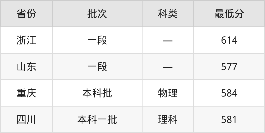 广东药科大学临床医学专业在全国各省最低录取分数线为577分(山东),除此之外,在其余地区的最低分为浙江614分、重庆物理类584分、四川理科581分,以上数据均为2024年数据,供2025年高考生参考。