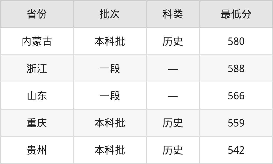 浙江传媒学院数字人文专业在全国各省最低录取分数线为542分(贵州历史类),除此之外,在其余地区的最低分为山东566分、重庆历史类559分、内蒙古历史类580分、浙江588分,以上数据均为2025年数据,供2026年高考生参考。