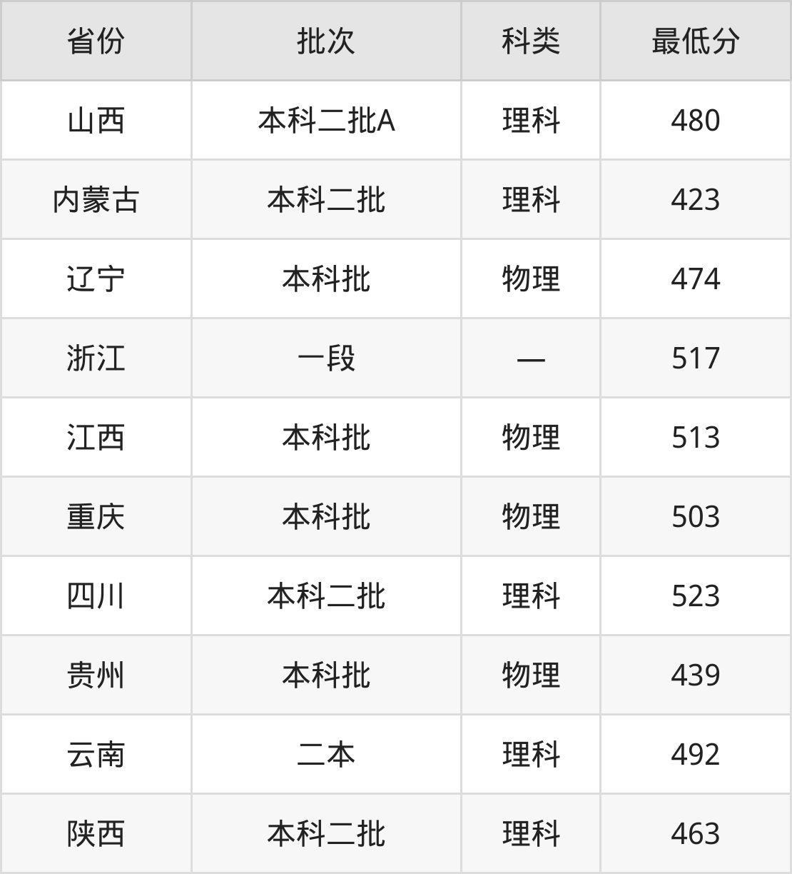 黑龙江科技大学道路桥梁与渡河工程专业在全国各省最低录取分数线为423分(内蒙古理科),除此之外,在其余地区的最低分为辽宁物理类474分、浙江517分、江西物理类513分、重庆物理类503分等,以上数据均为2024年数据,供2025年高考生参考。