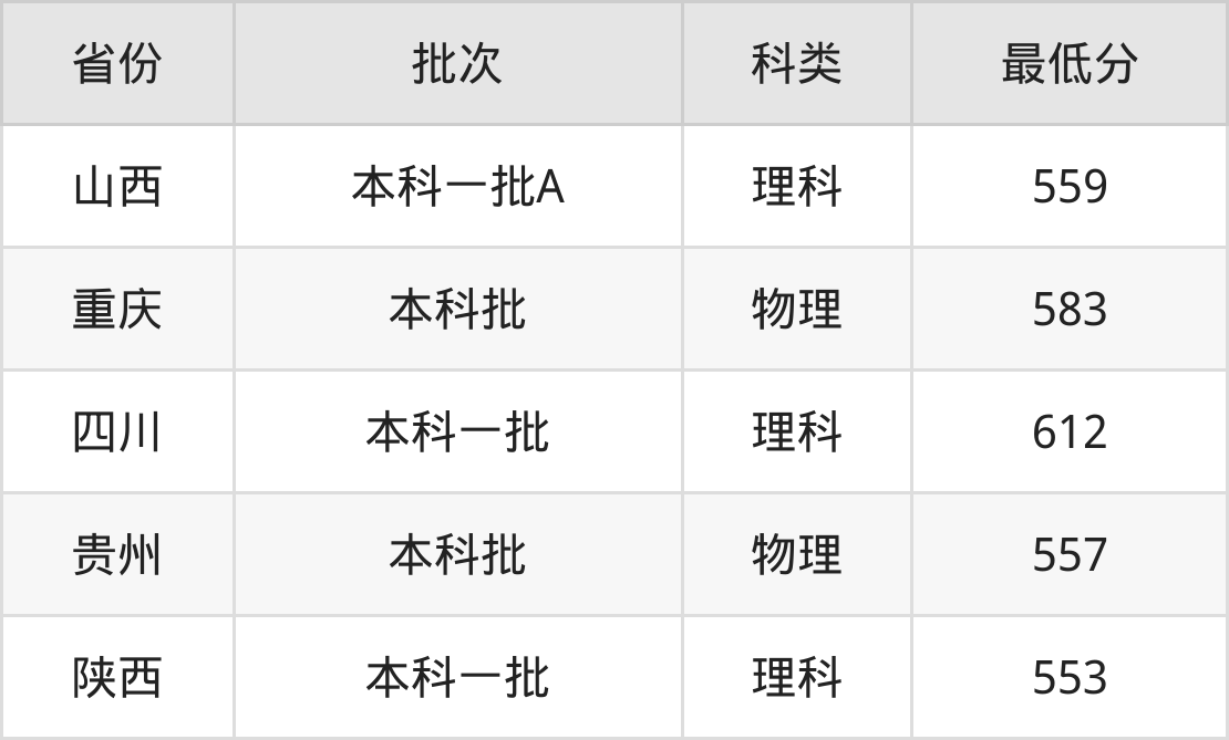 贵州大学医学检验技术专业在全国各省最低录取分数线为553分(陕西理科),除此之外,在其余地区的最低分为山西理科559分、重庆物理类583分、四川理科612分、贵州物理类557分,以上数据均为2024年数据,供2025年高考生参考。