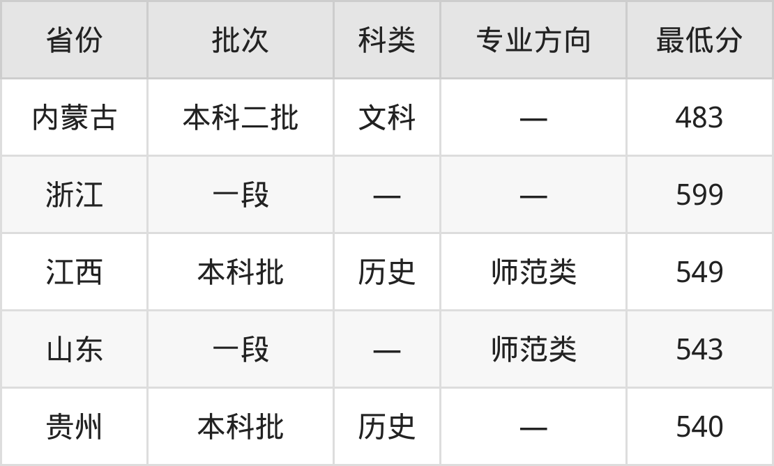 聊城大学思想政治教育专业在全国各省最低录取分数线为483分(内蒙古文科),除此之外,在其余地区的最低分为江西历史类549分、山东543分、贵州历史类540分、浙江599分,以上数据均为2024年数据,供2025年高考生参考。