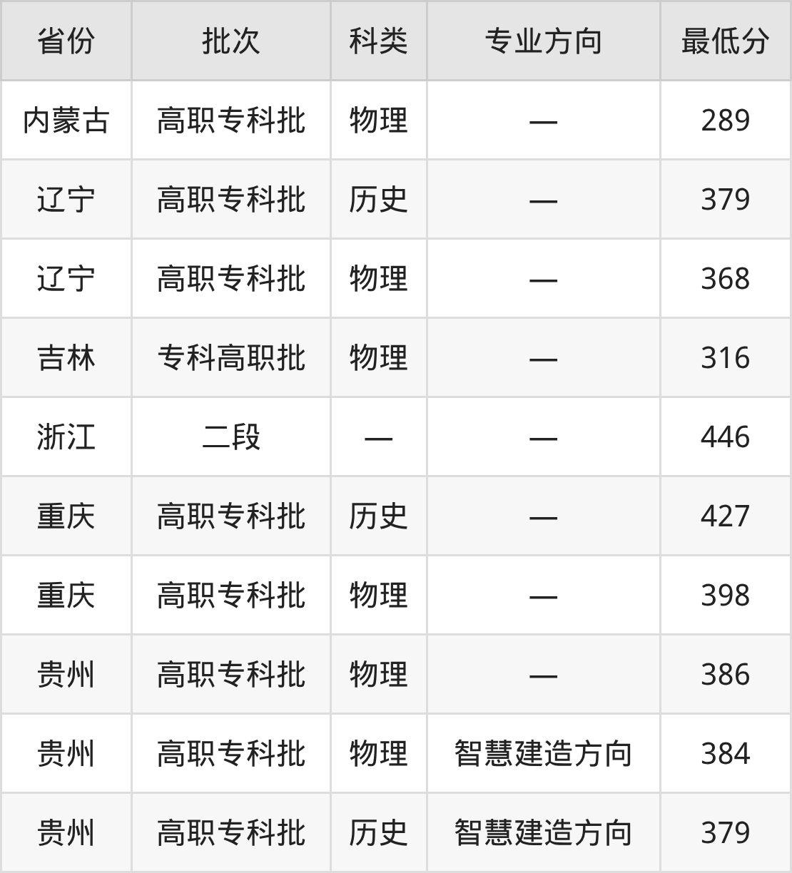 湖南工程职业技术学院建筑工程技术专业在全国各省最低录取分数线为289分(内蒙古物理类),除此之外,在其余地区的最低分为重庆物理类398分、贵州历史类379分、辽宁物理类368分、吉林物理类316分等,以上数据均为2025年数据,供2026年高考生参考。