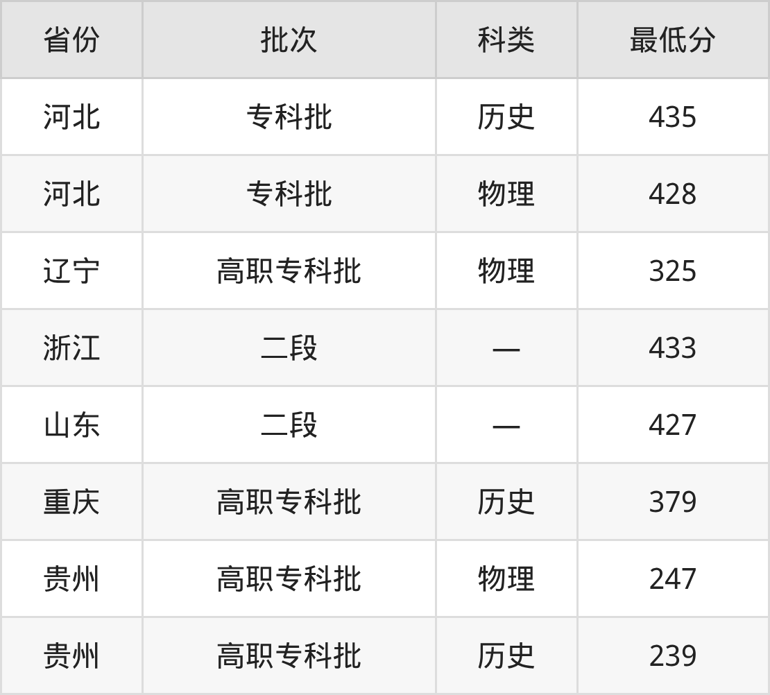 荆州理工职业学院计算机应用技术专业在全国各省最低录取分数线为239分(贵州历史类),除此之外,在其余地区的最低分为浙江433分、山东427分、重庆历史类379分、河北物理类428分等,以上数据均为2025年数据,供2026年高考生参考。