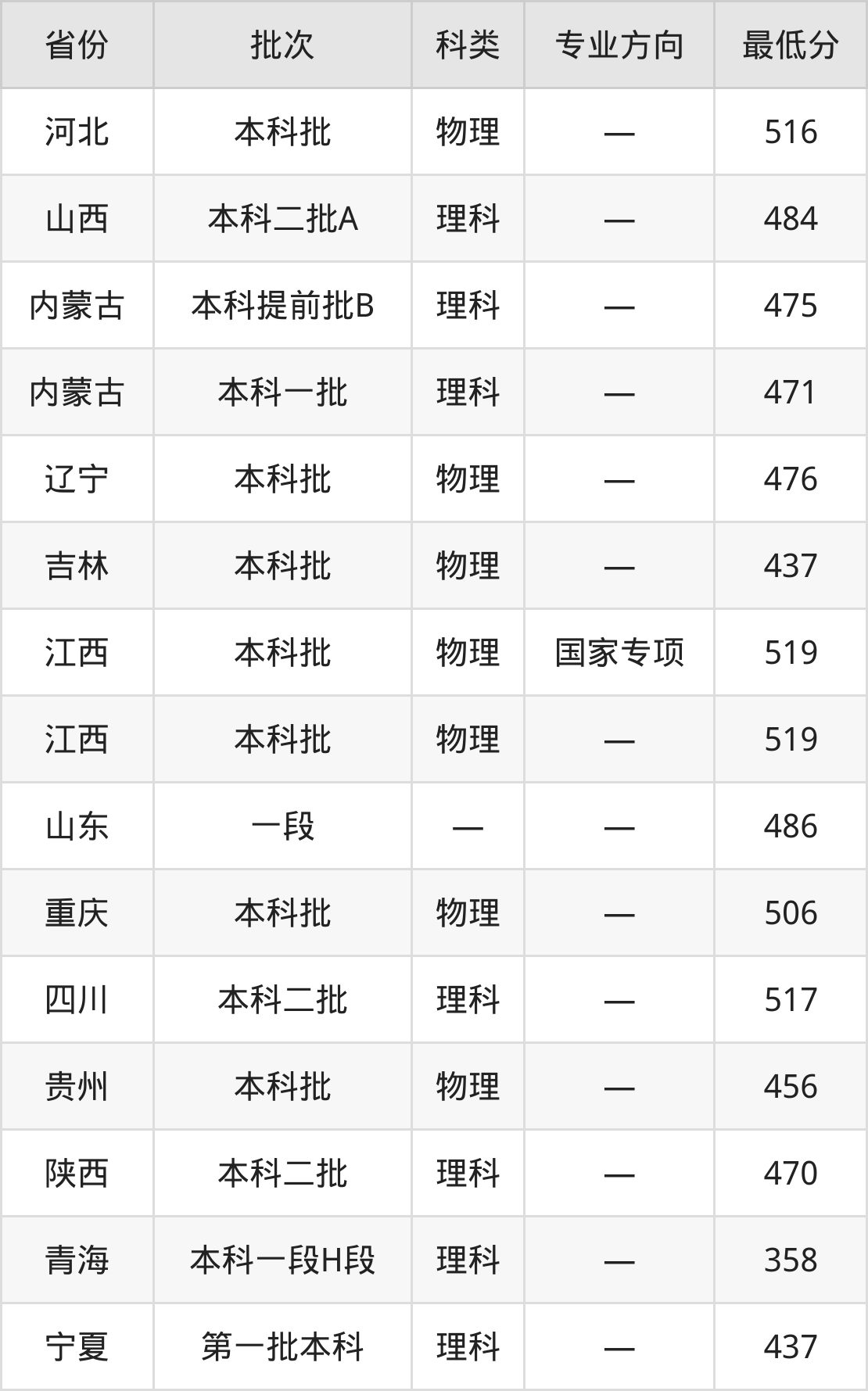 北方民族大学化工与制药类专业录取分数线从358分到519分不等,在部分地区的最低分数线如下: