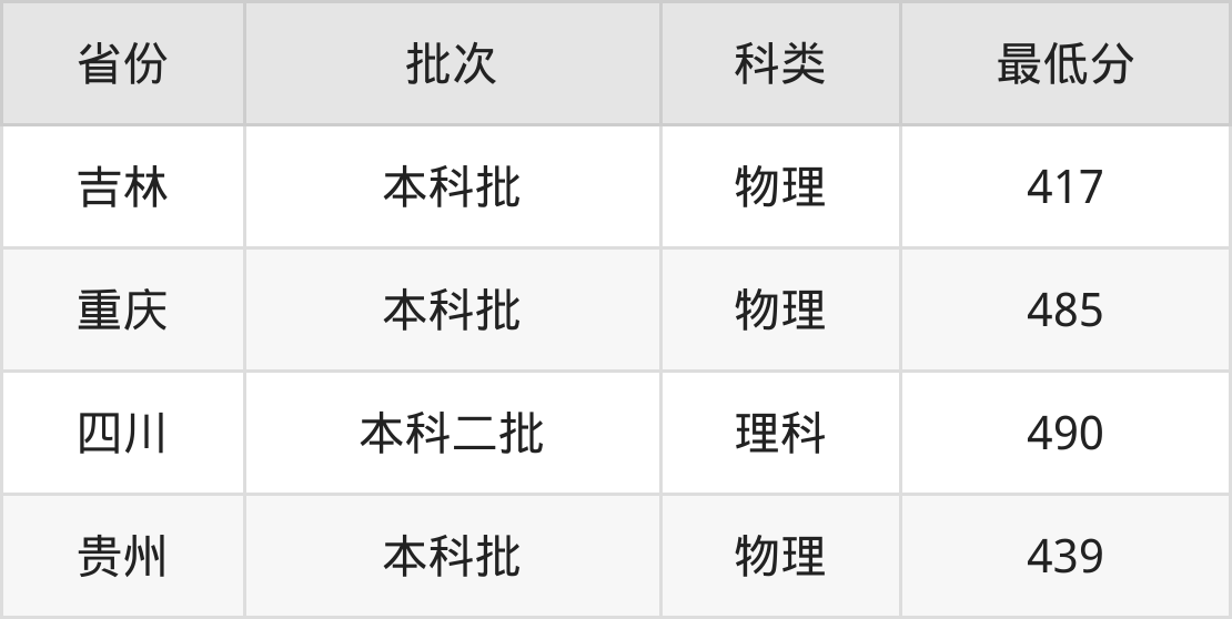 四川大学锦江学院通信工程专业在全国各省最低录取分数线为417分(吉林物理类),除此之外,在其余地区的最低分为重庆物理类485分、四川理科490分、贵州物理类439分,以上数据均为2024年数据,供2025年高考生参考。