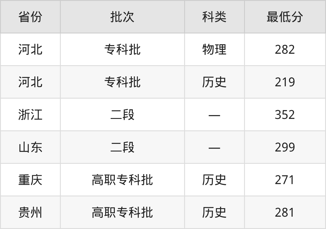 四川文化传媒职业学院艺术教育专业在全国各省最低录取分数线为219分(河北历史类),除此之外,在其余地区的最低分为浙江352分、山东299分、重庆历史类271分、贵州历史类281分,以上数据均为2025年数据,供2026年高考生参考。