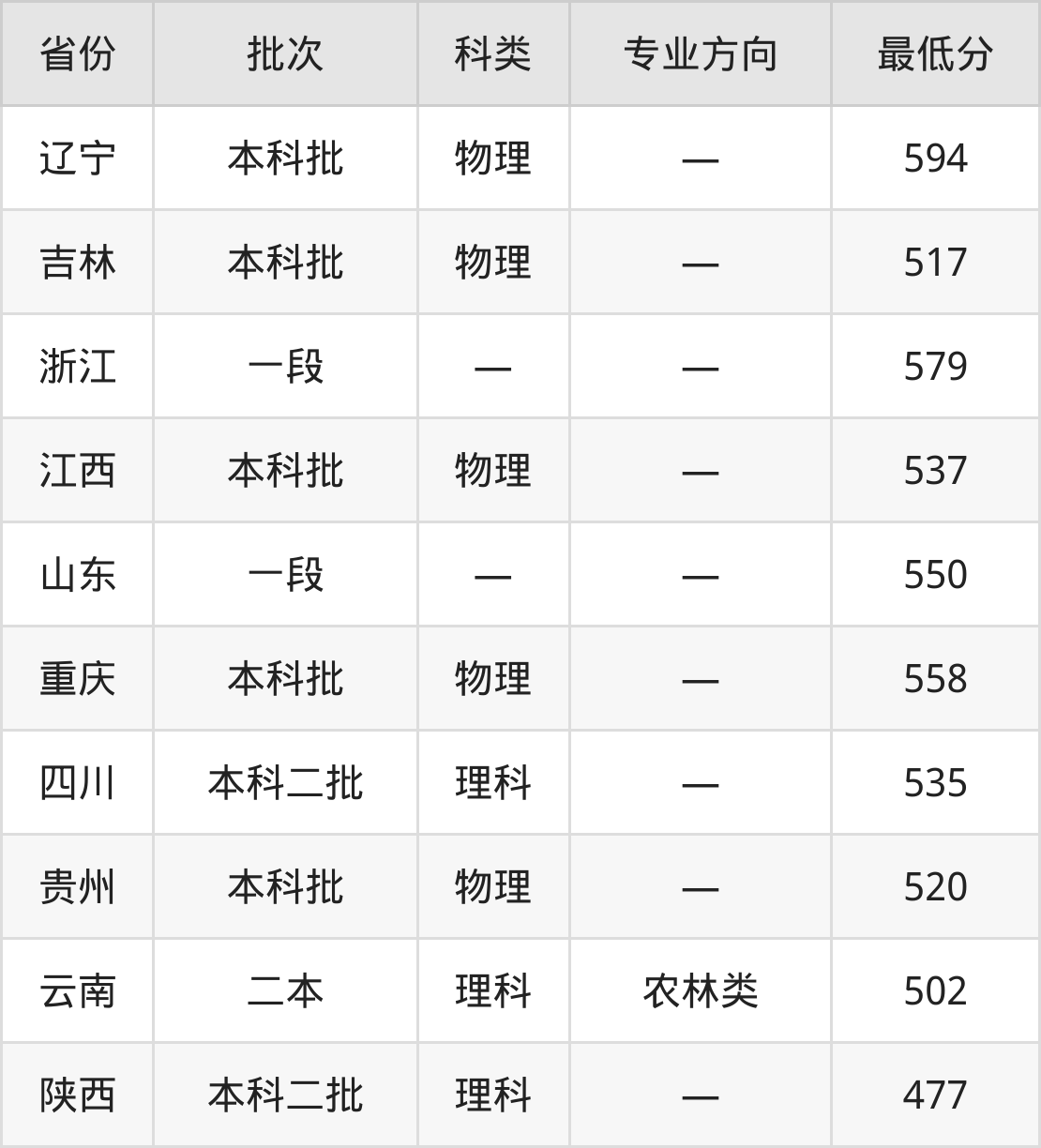 河南农业大学烟草专业在全国各省最低录取分数线为477分(陕西理科),除此之外,在其余地区的最低分为贵州物理类520分、辽宁物理类594分、江西物理类537分、重庆物理类558分等,以上数据均为2024年数据,供2025年高考生参考。