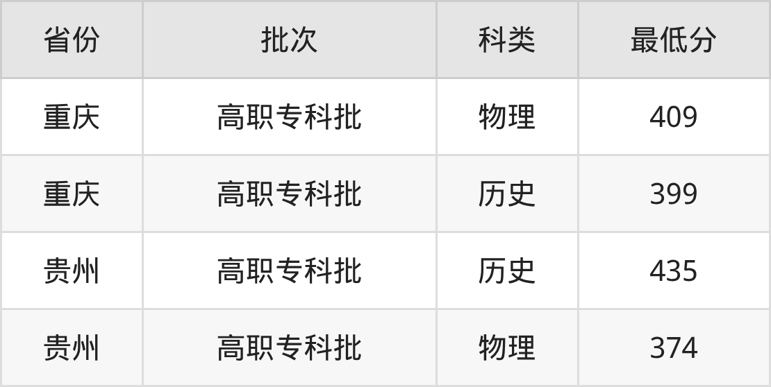 重庆公共运输职业学院铁道工程技术专业录取分数线从374分到435分不等,最低分数线如下: