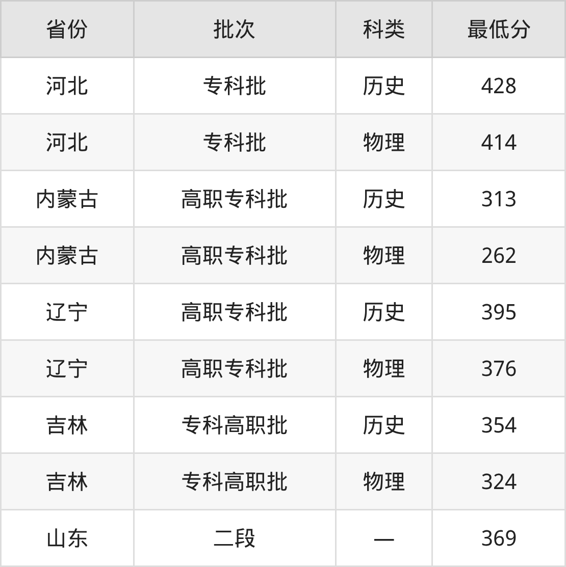 赤峰应用技术职业学院护理专业录取分数线从262分到428分不等,最低分数线如下: