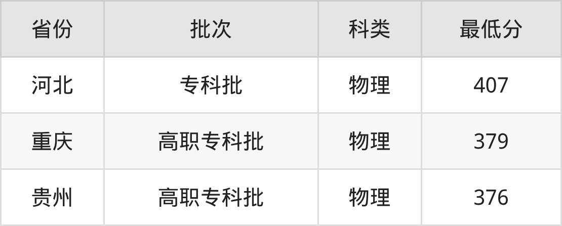 贵州工业职业技术学院数控技术专业在全国各省最低录取分数线为376分(贵州物理类),除此之外,在其余地区的最低分为河北物理类407分、重庆物理类379分,以上数据均为2025年数据,供2026年高考生参考。