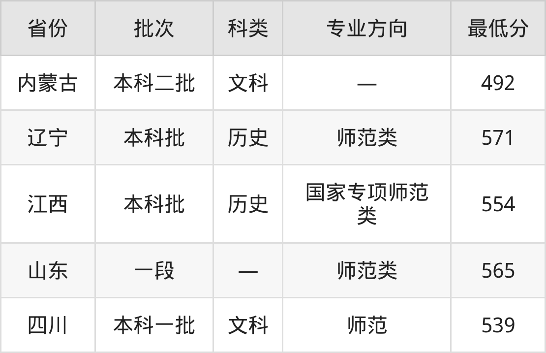哈尔滨师范大学历史学专业在全国各省最低录取分数线为492分(内蒙古文科),除此之外,在其余地区的最低分为辽宁历史类571分、江西历史类554分、山东565分、四川文科539分,以上数据均为2024年数据,供2025年高考生参考。