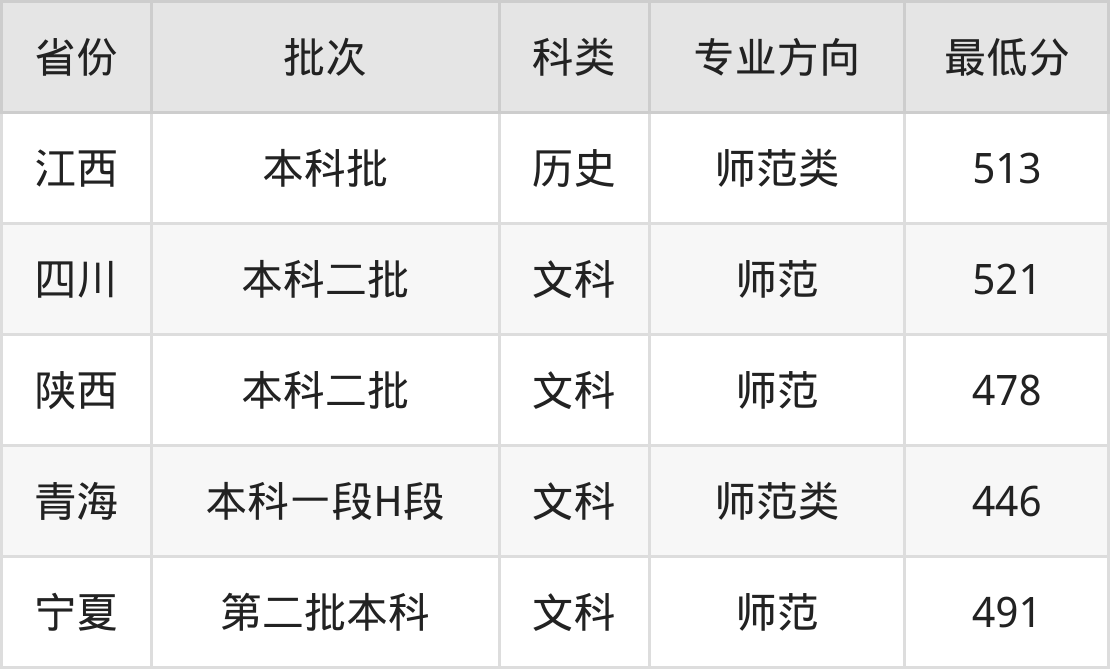 咸阳师范学院历史学专业在全国各省最低录取分数线为446分(青海文科),除此之外,在其余地区的最低分为江西历史类513分、四川文科521分、陕西文科478分、宁夏文科491分,以上数据均为2024年数据,供2025年高考生参考。