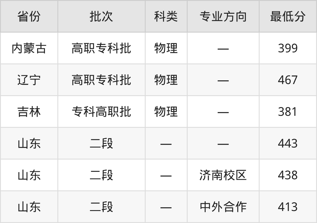 山东医学高等专科学校护理专业在全国各省最低录取分数线为381分(吉林物理类),除此之外,在其余地区的最低分为山东413分、内蒙古物理类399分、辽宁物理类467分,以上数据均为2025年数据,供2026年高考生参考。