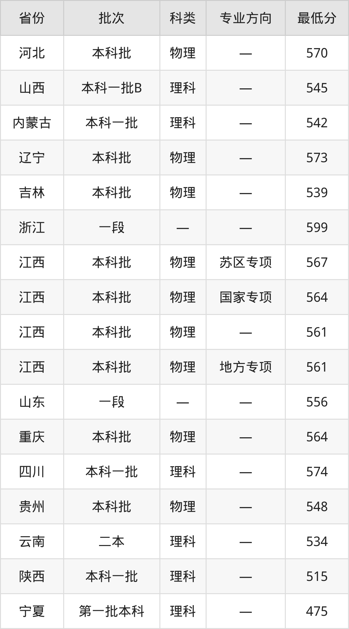 华东交通大学机械电子工程专业录取分数线从475分到599分不等,在部分地区的最低分数线如下: