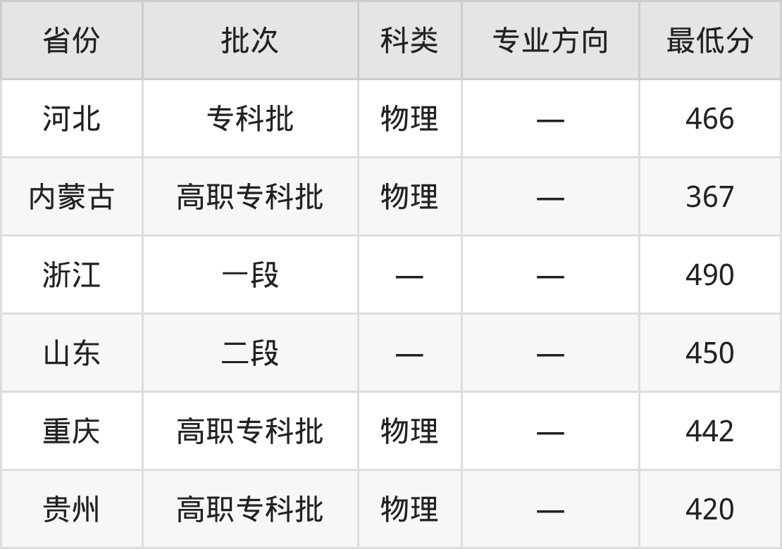 广州铁路职业技术学院铁道运输类专业在全国各省最低录取分数线为367分(内蒙古物理类),除此之外,在其余地区的最低分为河北物理类466分、浙江490分、山东450分、重庆物理类442分等,以上数据均为2025年数据,供2026年高考生参考。