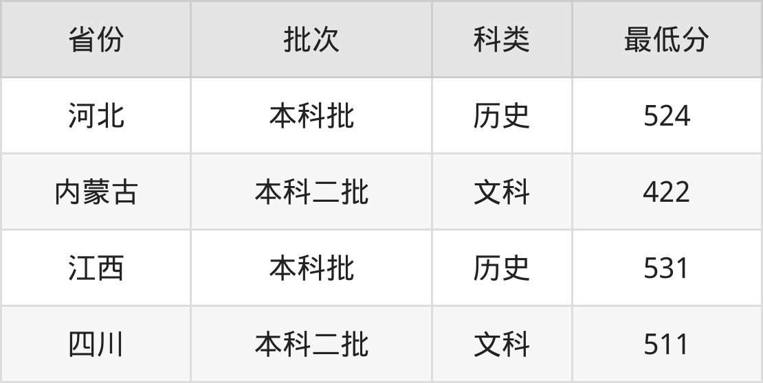 湘南学院社会工作专业在全国各省最低录取分数线为422分(内蒙古文科),除此之外,在其余地区的最低分为四川文科511分、河北历史类524分、江西历史类531分,以上数据均为2024年数据,供2025年高考生参考。