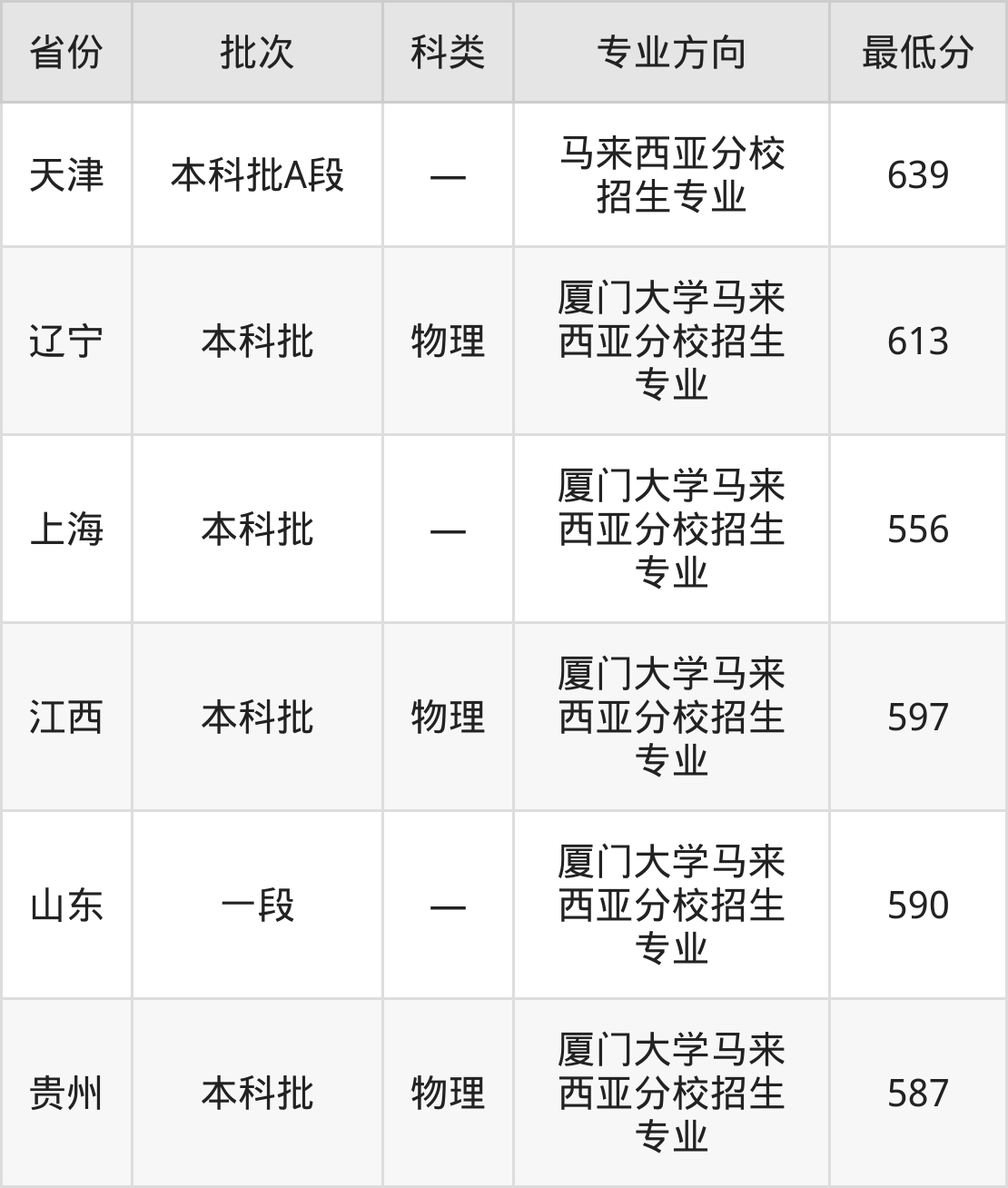 厦门大学软件工程专业录取分数线从556分到639分不等,最低分数线如下: