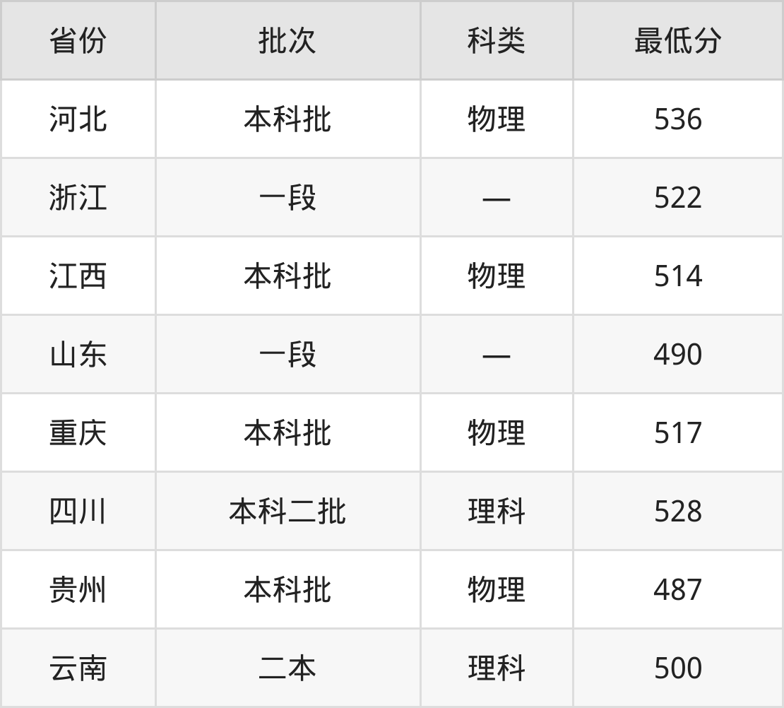 桂林航天工业学院数据科学与大数据技术专业在全国各省最低录取分数线为487分(贵州物理类),除此之外,在其余地区的最低分为江西物理类514分、山东490分、重庆物理类517分、四川理科528分等,以上数据均为2024年数据,供2025年高考生参考。