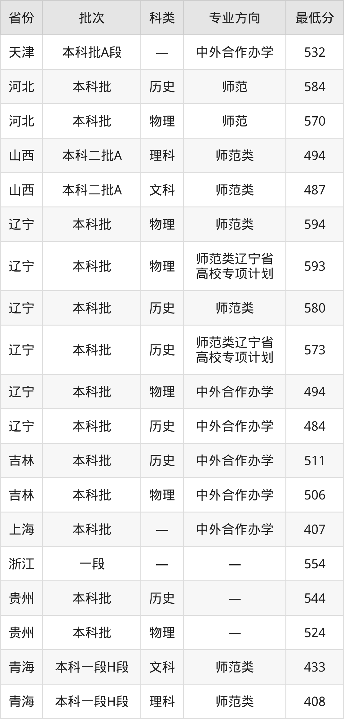 辽宁师范大学英语专业录取分数线从407分到594分不等,最低分数线如下: