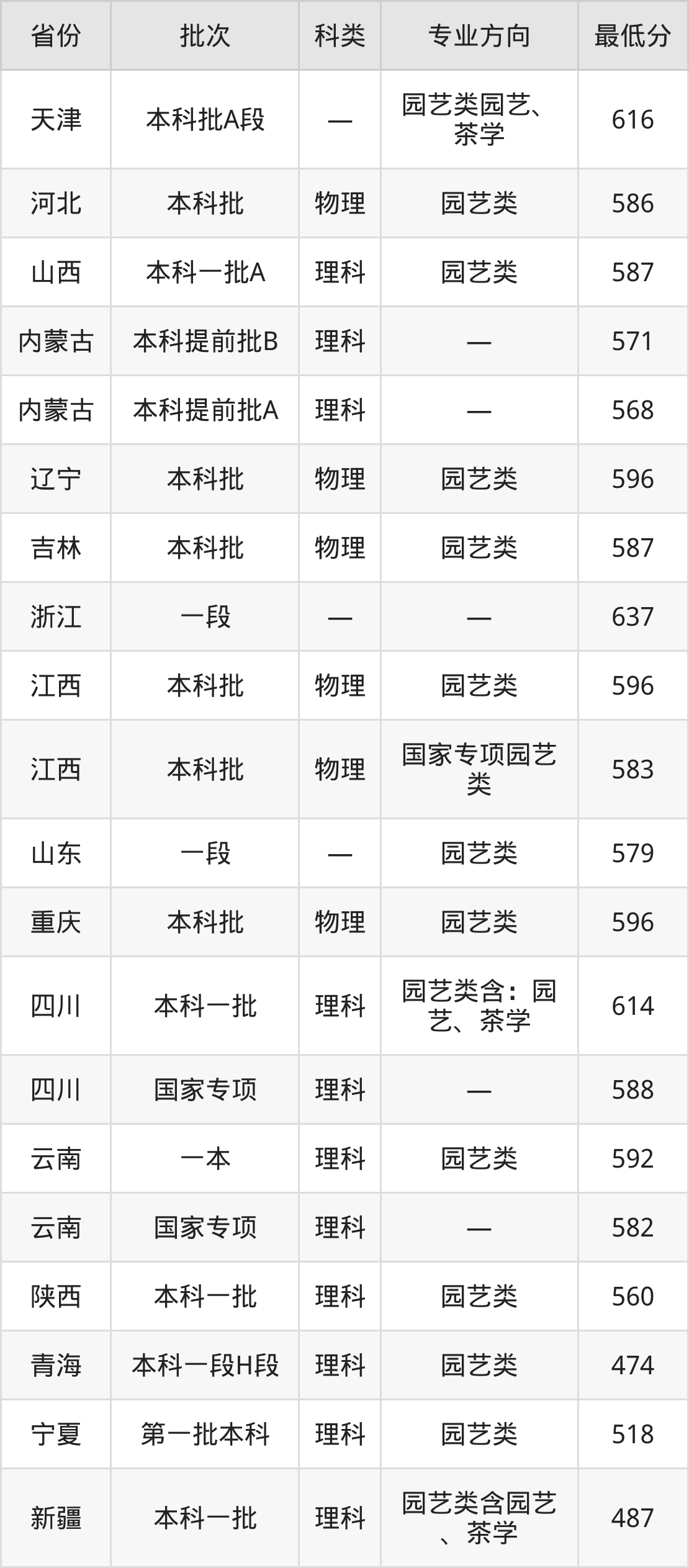西北农林科技大学园艺专业在全国各省录取分数线: