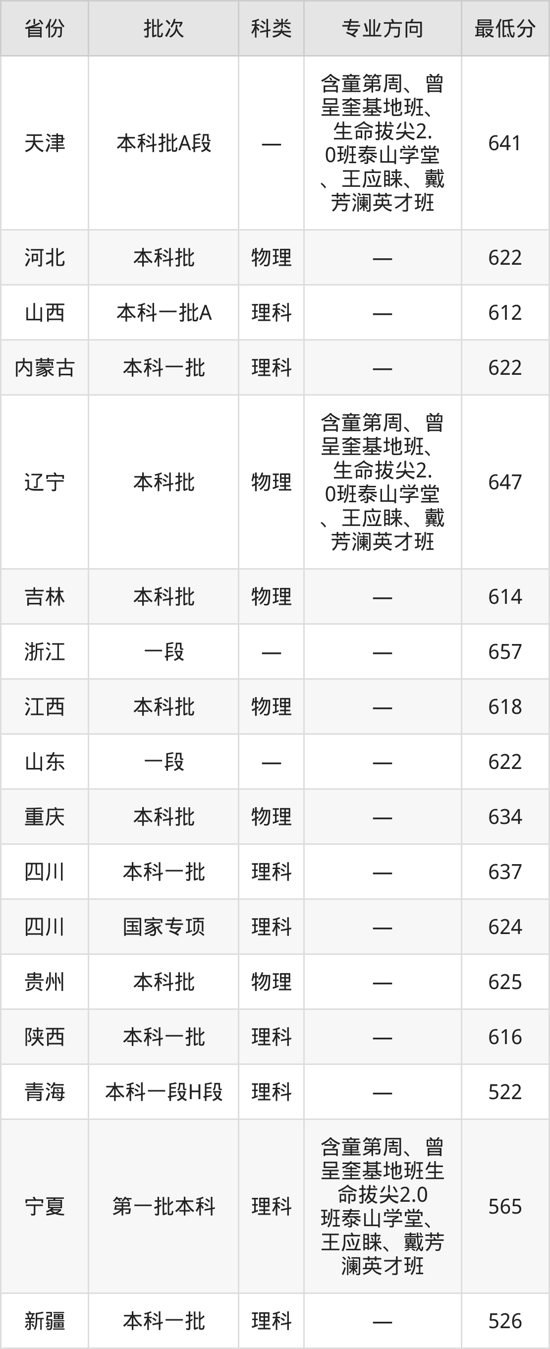 山东大学生物科学类专业录取分数线从522分到657分不等,在部分地区的最低分数线如下: