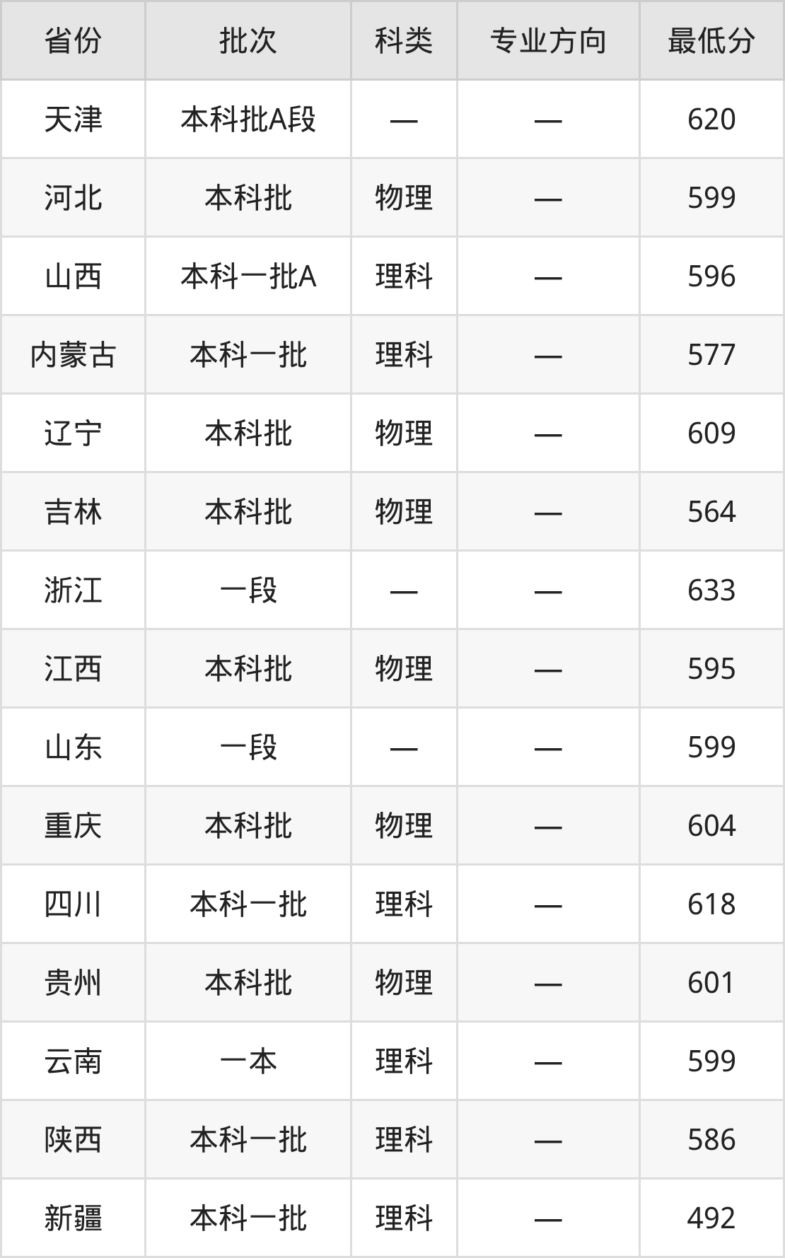 郑州大学物理学类专业录取分数线从492分到633分不等,在部分地区的最低分数线如下: