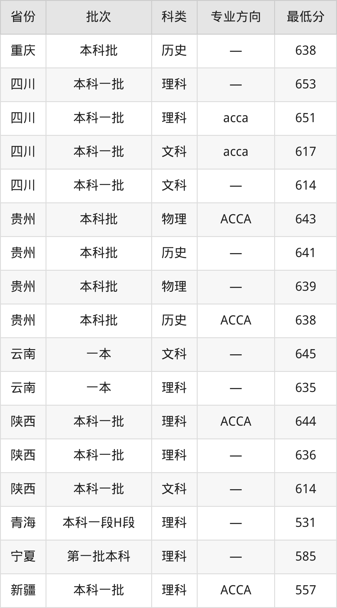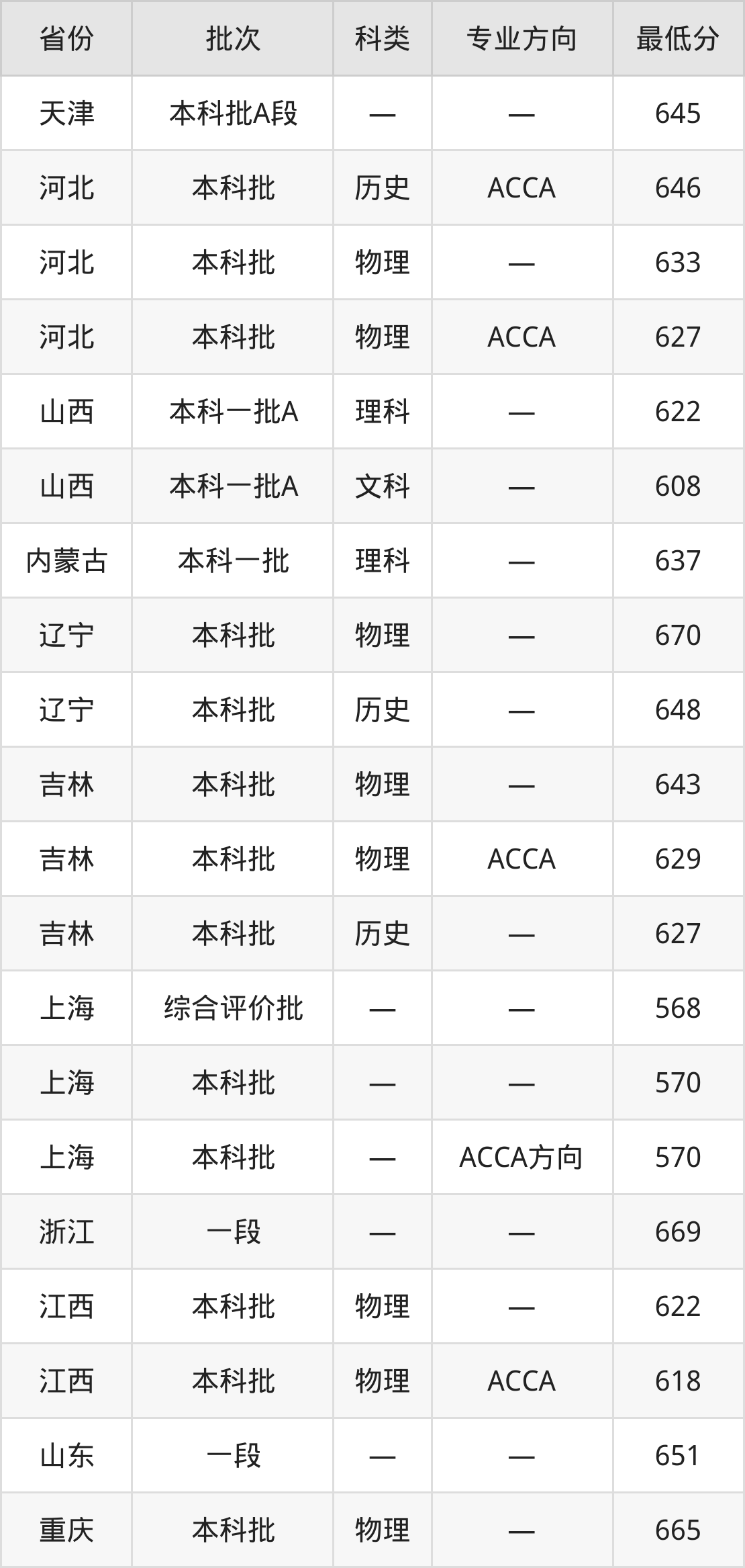 上海财经大学会计学专业录取分数线从531分到677分不等,在部分地区的最低分数线如下: