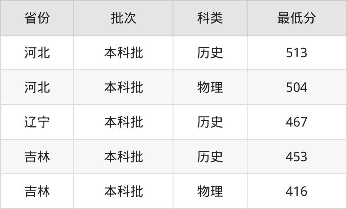 吉林工商学院日语专业录取分数线从416分到513分不等,最低分数线如下: