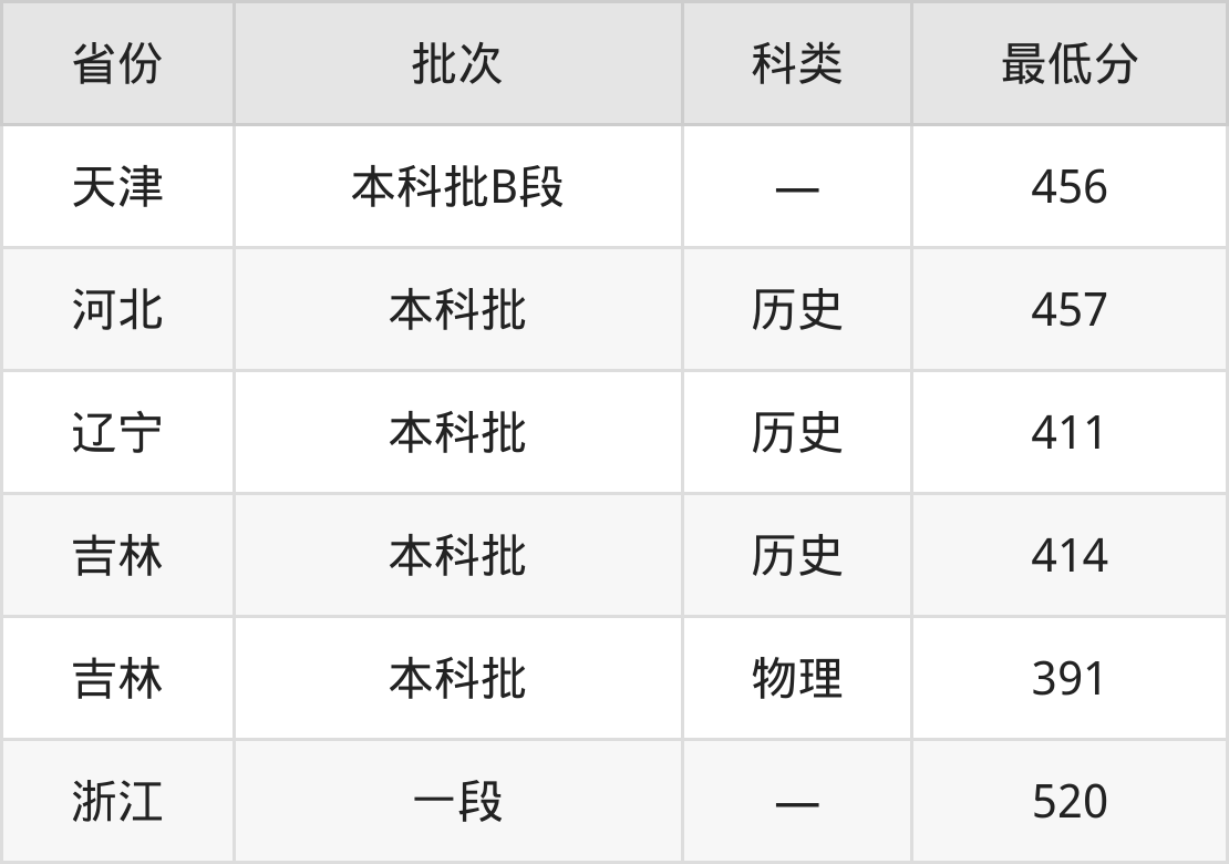 吉林师范大学博达学院日语专业录取分数线从391分到520分不等,最低分数线如下: