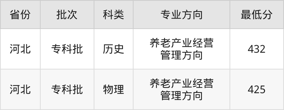秦皇岛职业技术学院智慧健康养老服务与管理专业录取分数线从425分到432分不等,最低分数线如下:
