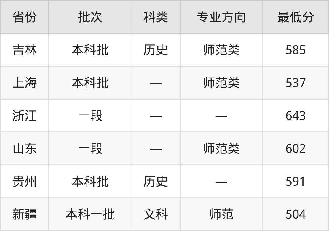 南京师范大学学前教育专业在全国各省最低录取分数线为504分(新疆文科),除此之外,在其余地区的最低分为吉林历史类585分、上海537分、浙江643分、山东602分等,以上数据均为2024年数据,供2025年高考生参考。