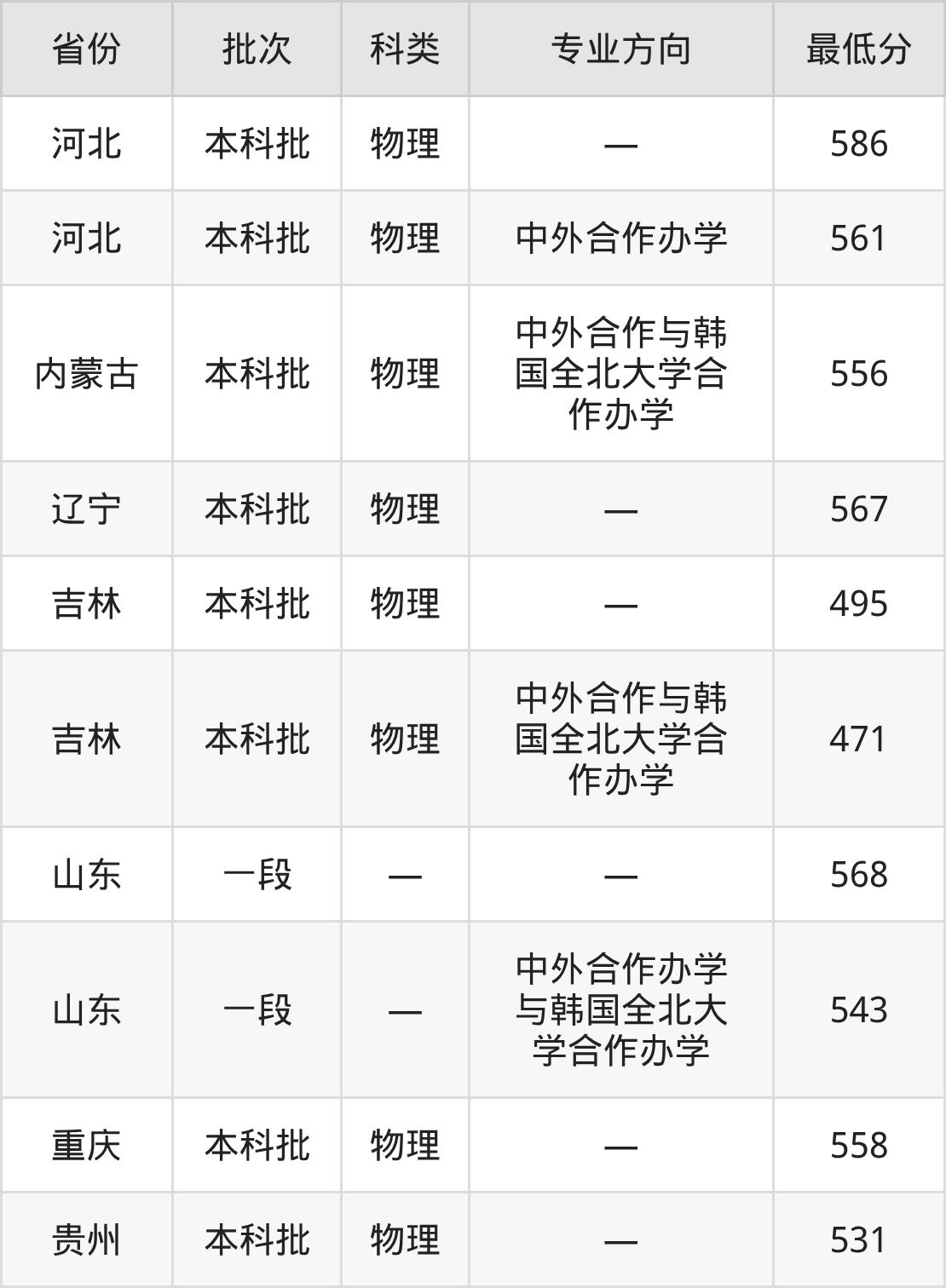 延边大学食品科学与工程专业录取分数线从471分到586分不等,最低分数线如下: