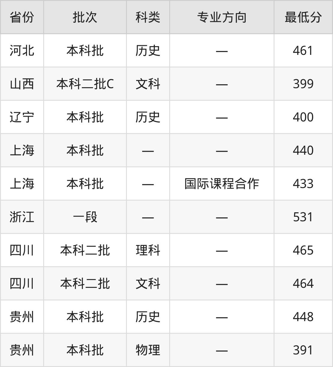 上海师范大学天华学院国际商务专业在全国各省最低录取分数线为391分(贵州物理类),除此之外,在其余地区的最低分为河北历史类461分、山西文科399分、辽宁历史类400分、上海433分等,以上数据均为2024年数据,供2025年高考生参考。