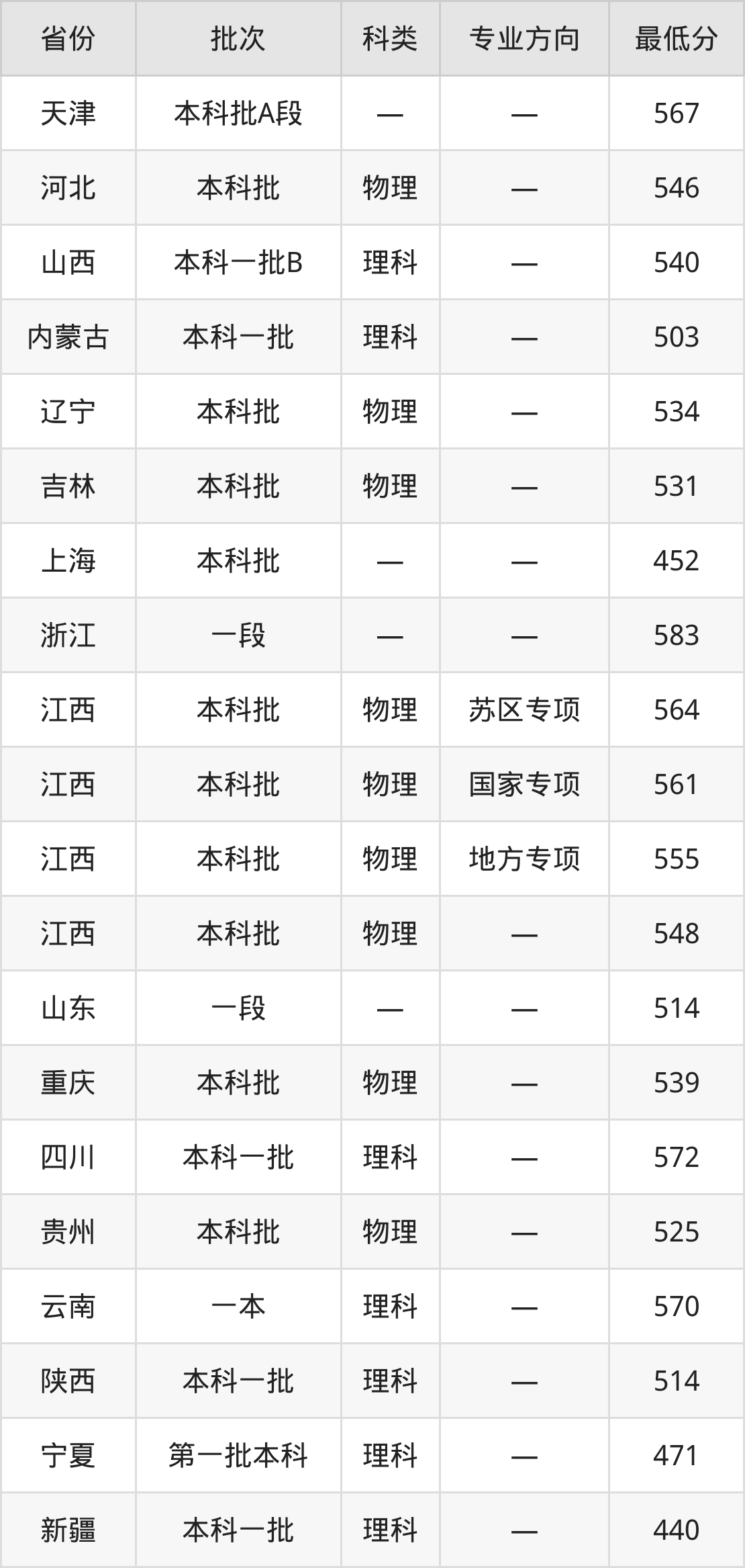 华东交通大学土木工程专业录取分数线从440分到583分不等,在部分地区的最低分数线如下: