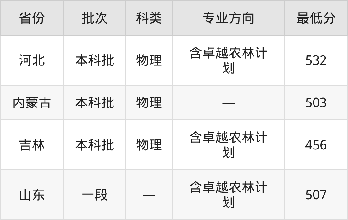 内蒙古农业大学农学专业在全国各省最低录取分数线为456分(吉林物理类),除此之外,在其余地区的最低分为山东507分、河北物理类532分、内蒙古物理类503分,以上数据均为2025年数据,供2026年高考生参考。
