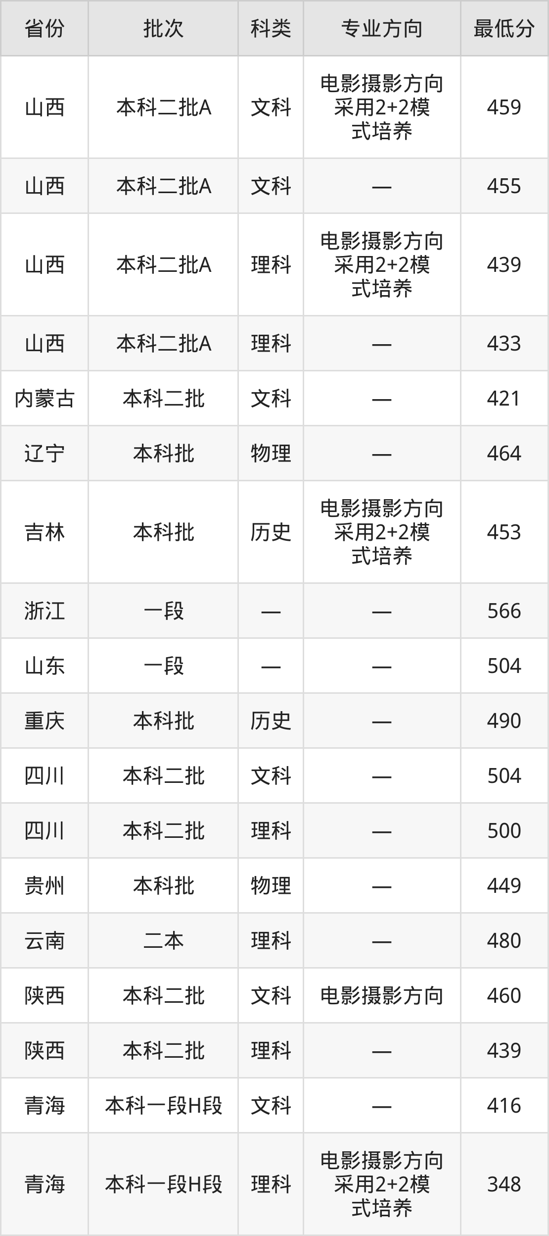 山西传媒学院影视摄影与制作专业在全国各省录取分数线: