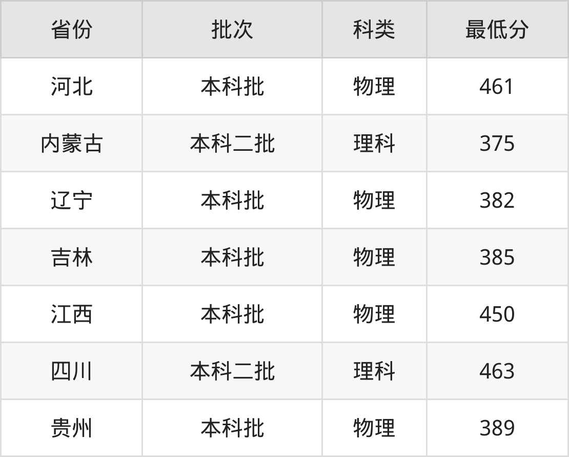 大连工业大学艺术与信息工程学院自动化专业在全国各省最低录取分数线为375分(内蒙古理科),除此之外,在其余地区的最低分为江西物理类450分、四川理科463分、贵州物理类389分、河北物理类461分等,以上数据均为2024年数据,供2025年高考生参考。