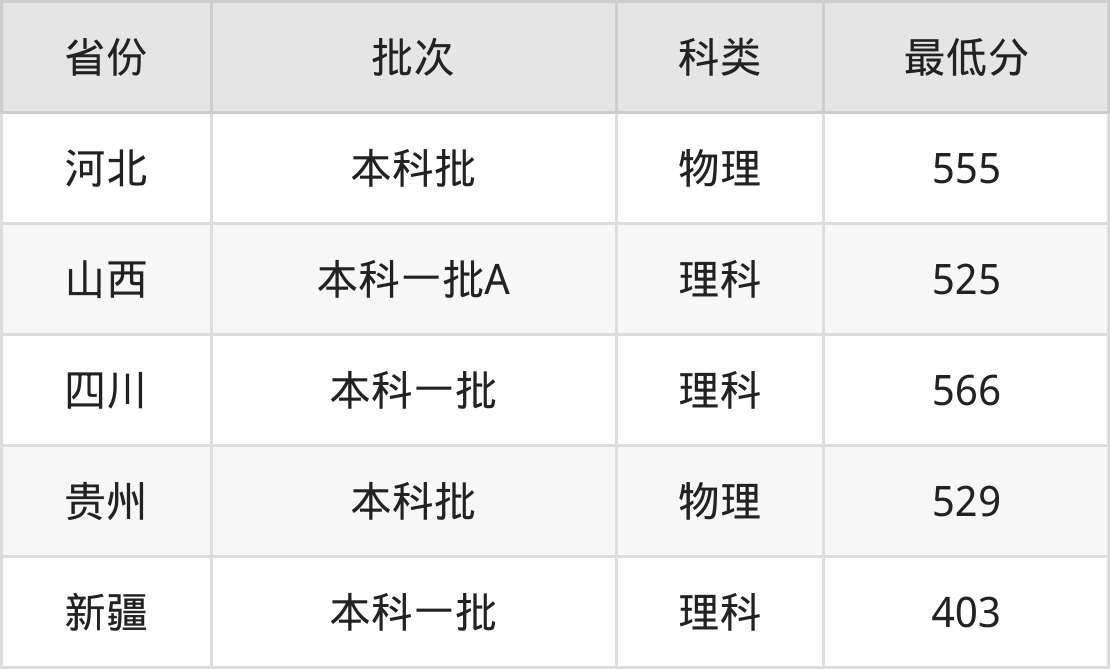 石河子大学康复治疗学专业在全国各省最低录取分数线为403分(新疆理科),除此之外,在其余地区的最低分为河北物理类555分、山西理科525分、四川理科566分、贵州物理类529分等,以上数据均为2024年数据,供2025年高考生参考。