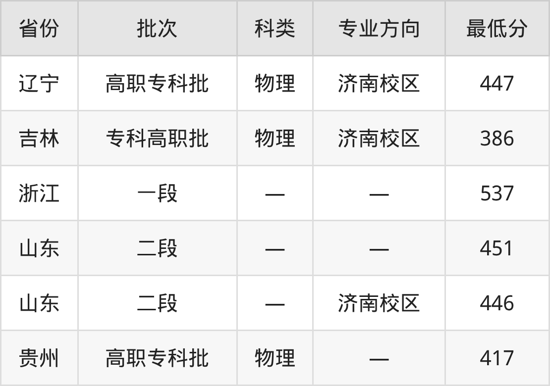 山东医学高等专科学校康复治疗技术专业在全国各省最低录取分数线为386分(吉林物理类),除此之外,在其余地区的最低分为辽宁物理类447分、浙江537分、山东446分、贵州物理类417分,以上数据均为2025年数据,供2026年高考生参考。