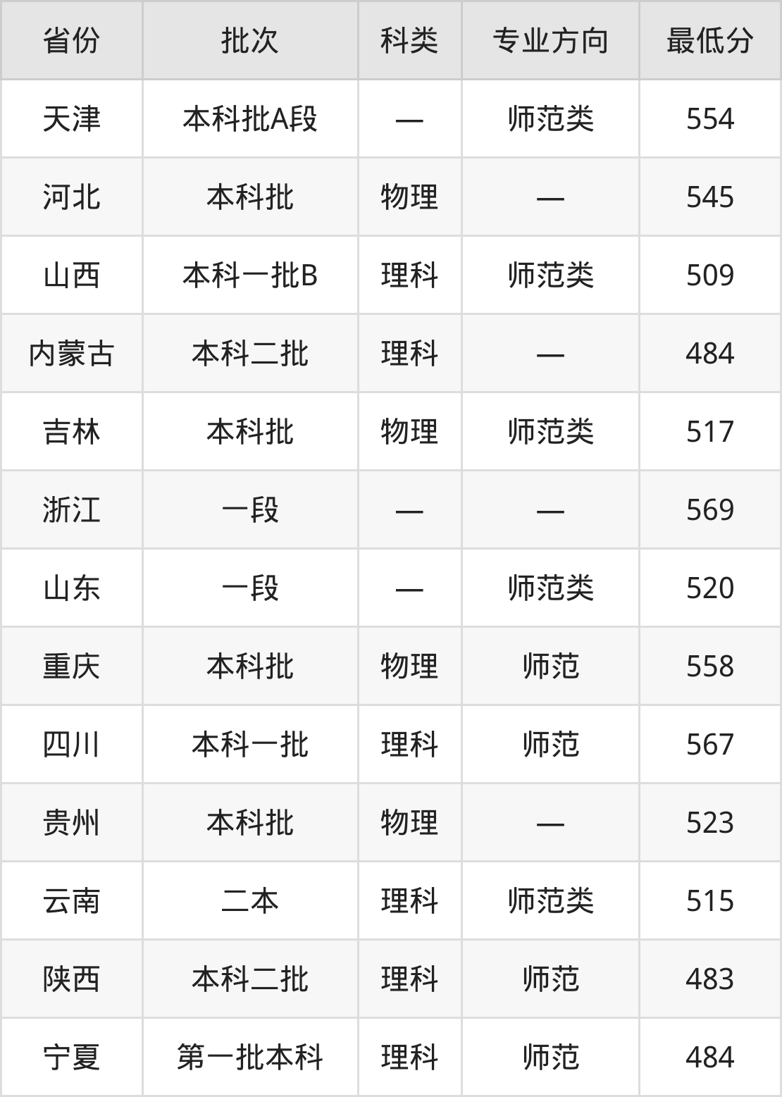 西北师范大学物理学专业录取分数线从483分到569分不等,在部分地区的最低分数线如下: