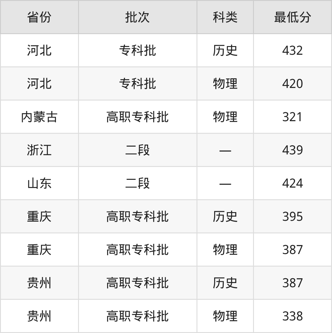 湖北城市建设职业技术学院道路与桥梁工程技术专业在全国各省最低录取分数线为321分(内蒙古物理类),除此之外,在其余地区的最低分为浙江439分、山东424分、重庆物理类387分、贵州物理类338分等,以上数据均为2025年数据,供2026年高考生参考。